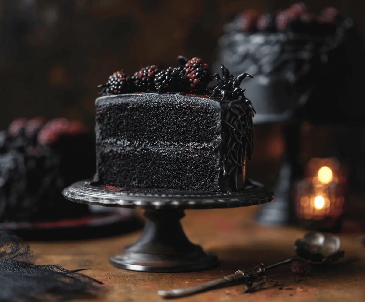 Now it’s time to get creative! Garnish your cake with fresh blackberries, dark red edible flowers, and, if you fancy, some black fondant horns for that spooky touch. Finish off by sprinkling a bit of black sanding sugar or edible glitter for that extra Halloween sparkle!