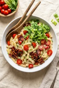 - Romaine — This is the fresh, crunchy piece that makes the salad feel like a BLT instead of just bacon pasta. Use crisp leaves and chop them into pieces that are big enough to notice. If the romaine looks limp in the bowl, it was added too early or dried poorly.
