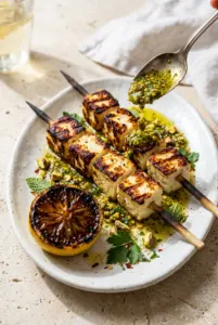 Golden-charred halloumi skewers are one of those appetizers that disappear before the rest of dinner even gets started. The cheese stays chewy and salty in the middle, the edges take on a deep bronzed crust, and the charred lemon turns the whole plate sharp, smoky, and bright at the same time. Paired with a thick pistachio dressing, it feels polished without asking for much work.