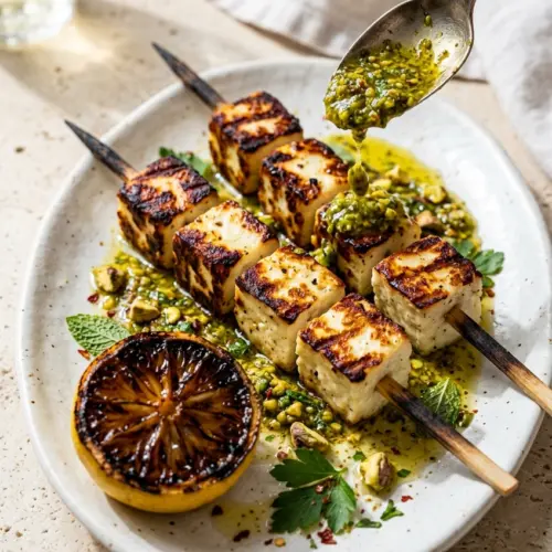 Lay the skewers on the grill and cook them for about 2 minutes per side. You’re looking for clear grill marks and a bronzed surface, not melting. The cheese should soften at the edges but still feel structured when you turn it. Spread the pistachio dressing on the plate first, then set the skewers on top and squeeze one charred lemon over everything while it’s still hot.