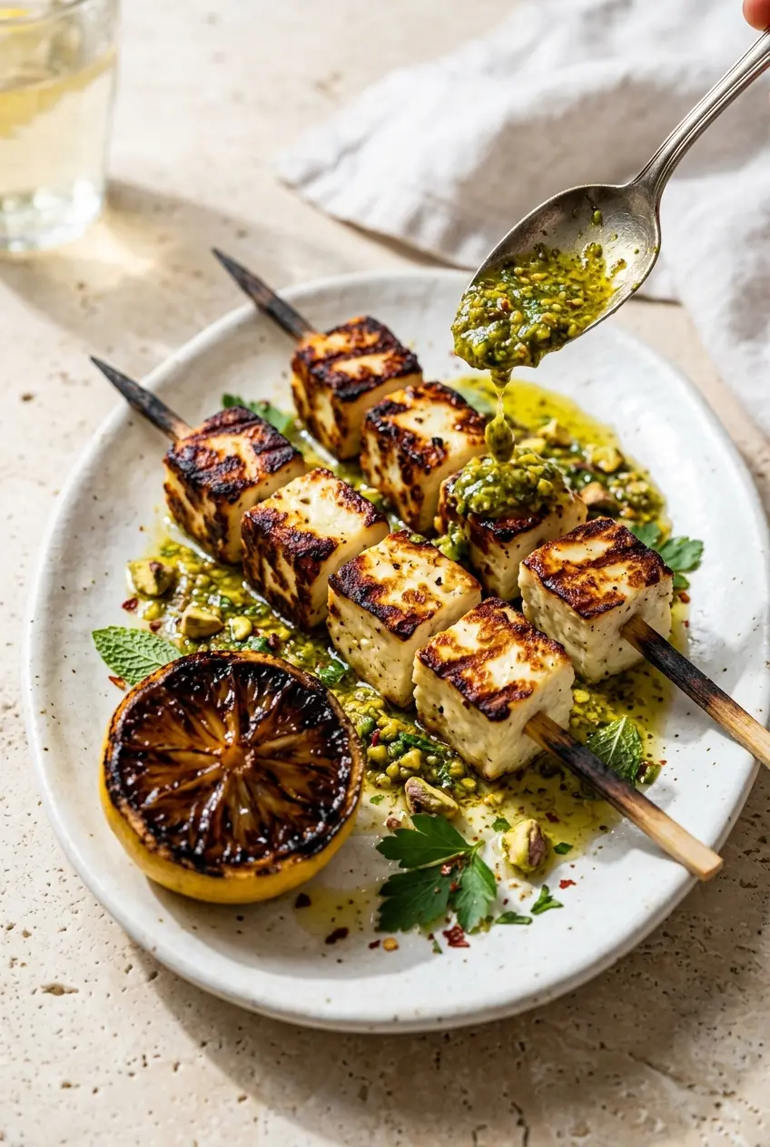 Charred Lemon Halloumi Skewers with Pistachio Dressing