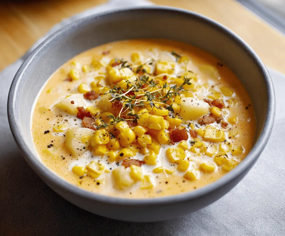 Dish out the chowder into bowls, and don’t forget to sprinkle on the reserved crispy bacon pieces and garnish with extra thyme leaves. Enjoy every comforting spoonful of your creamy, homemade corn chowder!