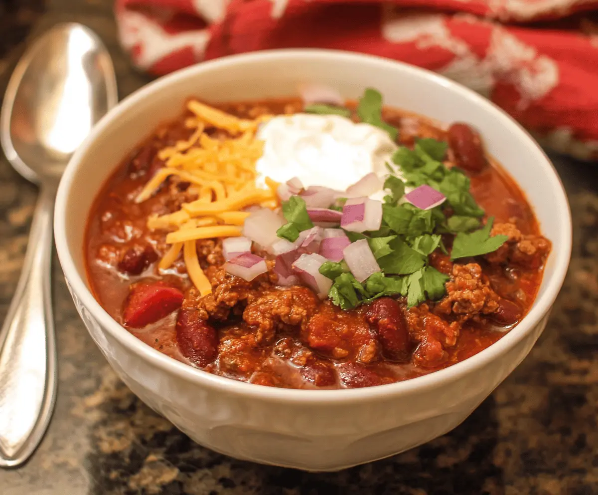 Ladle the hot chili into bowls and don’t forget the garnishes! Top each bowl with a sprinkle of shredded cheddar cheese, a dollop of sour cream, and some chopped red onion and cilantro for that fresh burst of flavor.