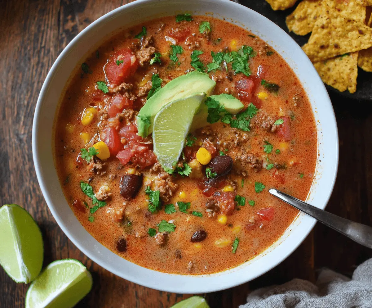 Enjoy this vibrant, comforting Dairy-Free Taco Soup that captures all the bold flavors of tacos without any dairy! Perfect for a cozy meal with family and friends. 🌮
