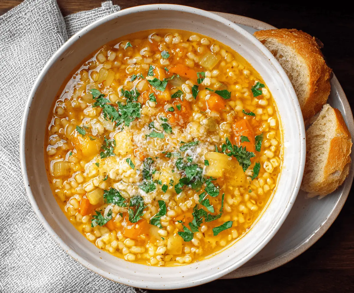 A bowl of warm Italian Pastina Soup with tiny pasta, vegetables, and herbs, served in a white ceramic bowl on a rustic wooden table.