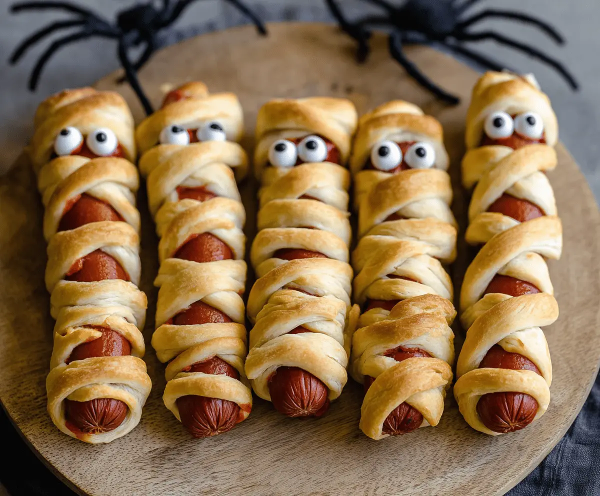 Mummy Hot Dogs are a fun and spooky treat that’s perfect for Halloween! Made with crescent roll dough wrapped around hot dogs, they look like little mummies when baked!