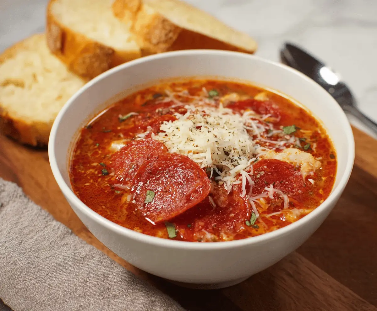 Enjoy your cozy and comforting Pepperoni Pizza Soup that brings all the deliciousness of pizza right to your bowl!