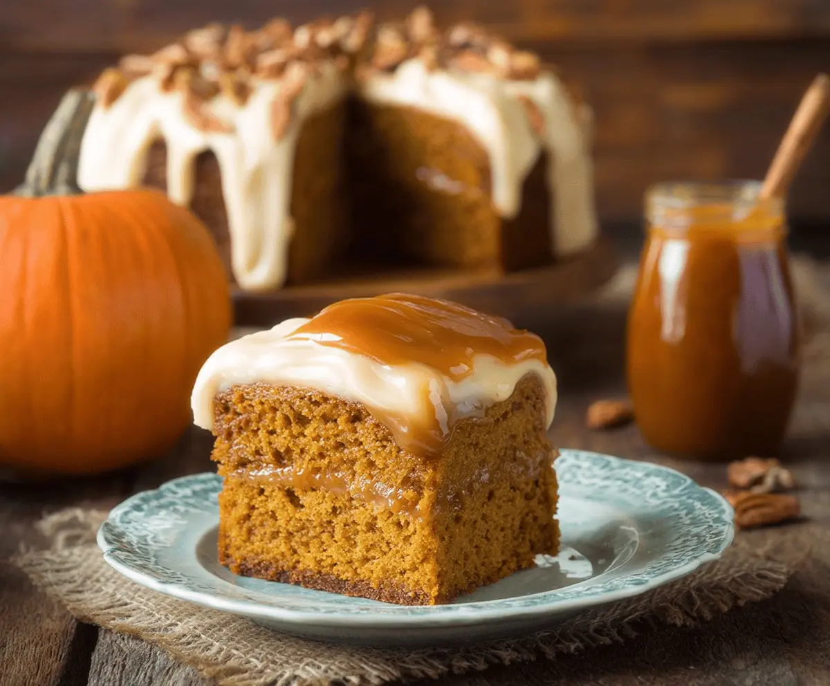This delightful recipe yields a flavorful pumpkin cake that is moist and enhanced with the silky caramel cream cheese frosting, providing the perfect blend of spices and sweetness. Enjoy every bite!