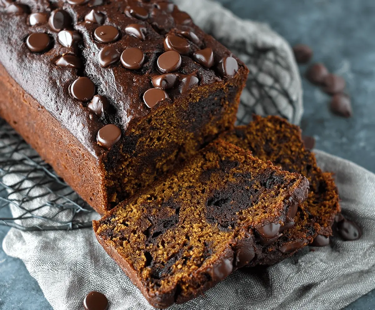 Delicious homemade pumpkin chocolate bread sliced and ready to enjoy, showcasing a moist texture with chocolate chips and a festive fall flavor