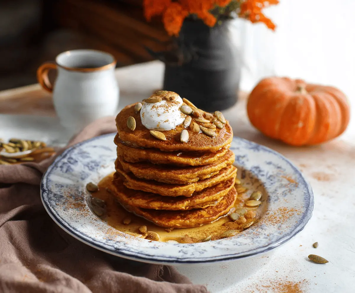 Stack the pancakes up high on a plate. Top with a dollop of Greek yogurt or whipped cream, a sprinkle of pumpkin seeds, a dusting of cinnamon, and a drizzle of maple syrup for extra sweetness. Enjoy your cozy breakfast!