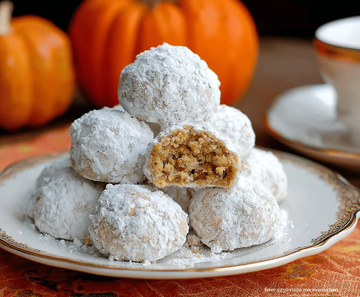 Delicious Pumpkin Snowball Cookies with powdered sugar, festive fall dessert, homemade holiday treat, golden-brown cookies coated in powdered sugar