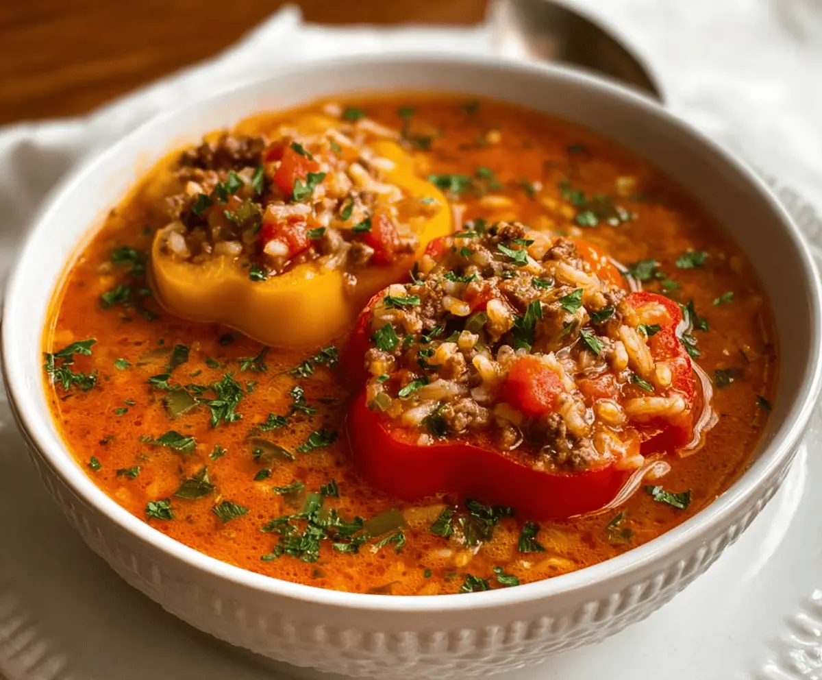 This warm and colorful stuffed bell pepper soup is like a hug in a bowl! It’s filled with tender peppers, hearty meat, and savory rice, making it a comforting meal for any day.